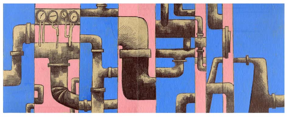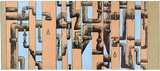 I have been sticking with the crosshatching and negative space painting method for a series of pipe drawings as my first go around. I have found that as I paint, I often lose some of the energy that my drawings possess. I am sure that the same energy can be achieved with paint, but I think with a little more focus on the drawing I may get myself to a better place than I have been recently. Then, hopefully, I will be able to return to the painting with a fresh mind and the capability of making it more loose and expressive. With any luck these qualities will come out as free as the drawing and not appear contrived.