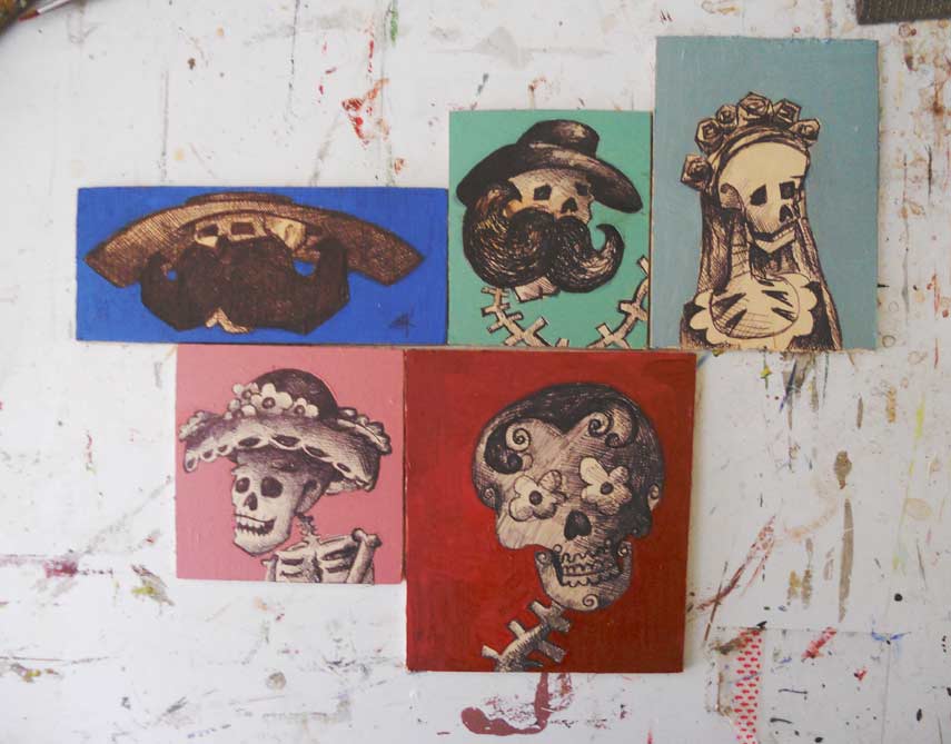 I also thought that I would share my Day of the Dead piece for Lunar Boy tonight. These are actually separate drawings, but it seemed easier to post as one photo. Yet again the hatching and painted negative space.