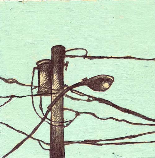 I placed a number of the panels in a grid as I finished them. The first grid was just a four pack, but started to make me think about the various layers of missed connections and interrupted lines of power.