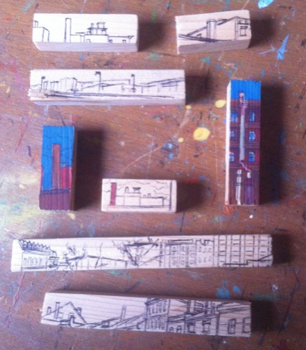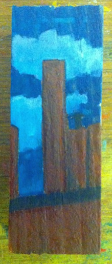 These two images detail a recent series of miniature city scapes that I have been putting together of Portland, Me. I thought that perhaps by looking in spots which were not quite so obvious I could find a certain kind of beauty in my surroundings that I cannot find by paying attention to the everyday things that I find in front of me while walking around the city. I began the series with watercolor on wooden blocks and have since switched to acrylic paints for archival purposes.