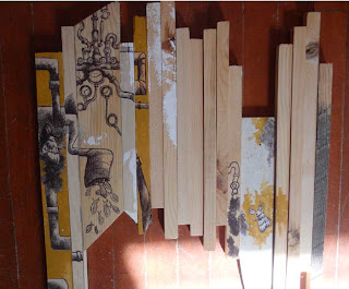 I am not sure that I am as big a fan of this particular color combination. Perhaps I should have gone with more of an off compliment green. There is a lot of pop in this but that blue seems so solid even here in digital form. I am also not so certain that I appreciate the large swatches of pipe drawing as the more segmented piece.