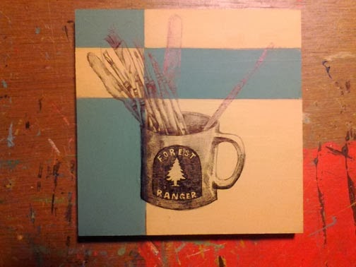 My father was a forest ranger in New York State, as followers of this blog well know. There were two mug designs that I remember from growing up. There was this one and one with a simple green tree on a very tiny mug. This commemorative mug is the mug that holds my paint brushes. While drawing this mug I couldn’t help but think of Jasper Johns castings of his mug and brush set up, but also was taken with thoughts of my dad, and drinking coffee at home.