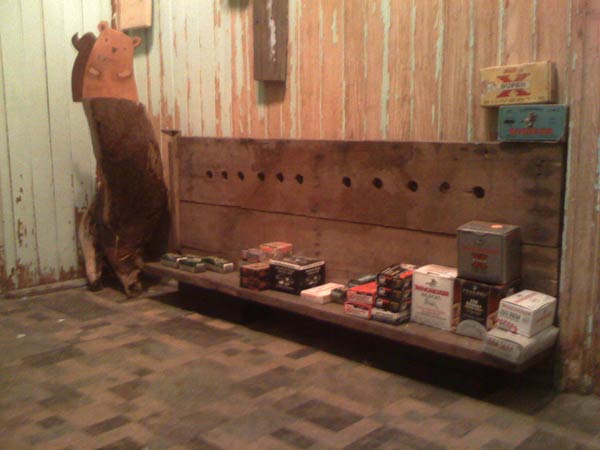 Generally my work does not address these two men, but since I was making a piece in the same area that I grew up, it made sense to change that.  I painted cartoon portraits of my grandfather, father and myself wearing checked woolen jackets and tuques.  I used found wood that had weathered and carries the same sort of patina that my entire home area boasts.  I also incorporated empty ammo boxes and a few squirrels.  No matter what you are hunting it seems you see more squirrels, unless of course it is squirrels that you are hunting.