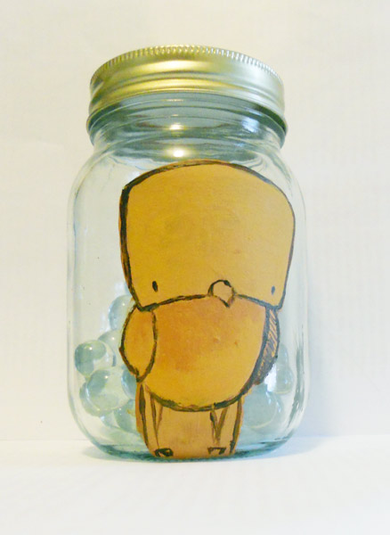 Today I finished a project for Artstream Studios upcoming Toy and Game show in September.  It is a series of jars containing marbles adorned with a cute and/or fuzzy animal.  It was partially based off of Barry McGee’s liquor bottles and partially because of the scene in Amelie where the fellow has the flashback about the fateful day where he wins and then loses all of the marbles during recess.