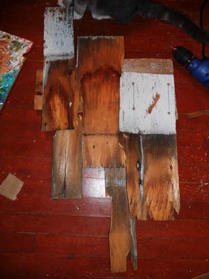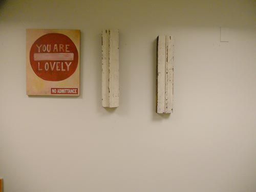 I really enjoy how the two pieces of raw found wood when placed in juxtaposition to my painted elements look painted. Also the tone on the two pieces is very similar to the wall and starts asking some interesting questions that I have had of late about art within the cube. It was also mentioned to me tonight that I should really show up to a construction site and make one of these. I do not know if I am up for this guerrilla art making ideal, but I do enjoy the idea of this type of project being site specific and located outside.