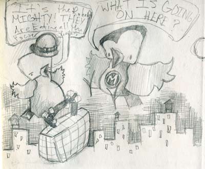 One of the beginning scenes here showing Mighty and a carpet-bagger pigeon. Think the pigeons name is Lenny. I really want the bird interactions in this comic to be reminiscent of the characters in a Damon Runyon short story. Those of you who don’t know Damon Runyon. Guys and Dolls was based on the characters and short stories created by Runyon. The books are way better.