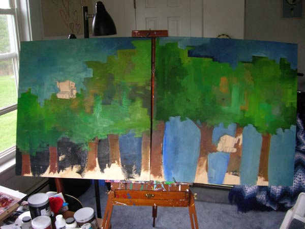 The Plumbing series continued this morning. My walk through the woods on Monday completely changed my position on where I thought roots and trunks belonged. There were so many trees with strange shapes bursting out of the ground. So I’ve been working at dropping the plane which the trees are coming out of.