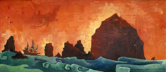 This year is the 25th Anniversary of “The Goonies”, and I have been working on a couple pieces for the Anniversary show in Astoria, OR, at Lunar Boy Gallery. I had been working on a couple portraits, one of Sean Astin which is coming around, but decided that I would like to do one of my quick landscape style pieces with One Eyed Willy’s ship.