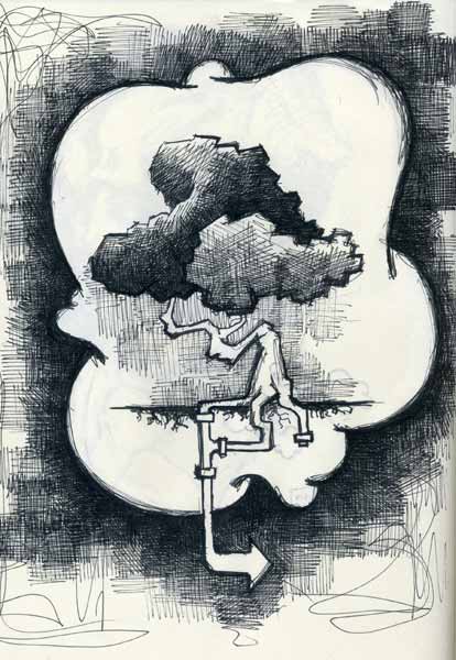I am in Portland. I have set up my studio and set up my scanning station and pumped up my air mattress. My clothes are neatly filed away and I have a new very awesome teapot and flamingo shower curtain. And so the summer begins. It is still nearly two months until my residency for MECA starts but I am here five days a week while working a day job and in New Hampshire three nights a week, hanging out with my lovely lady. Phew. So far everything is going pretty well, though tomorrow I need to get a couple jugs of water because I am dying of thirst, but on a more artistic basis, today I cranked out a sweet pen and ink drawing.