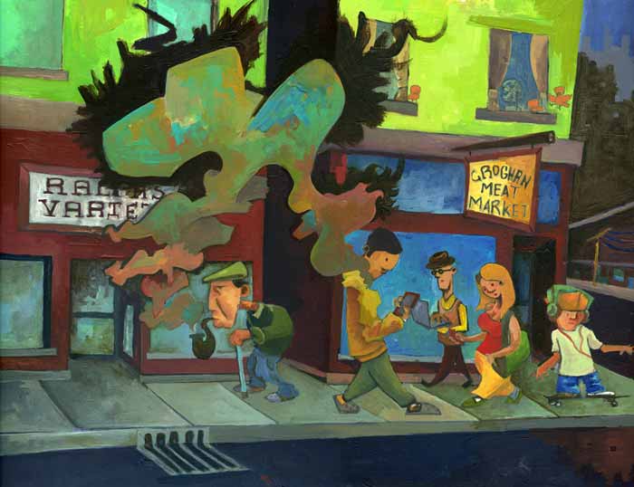 Smoke in a scene with other people. This piece is also based a little on conversations I’ve had with friends about too much social media in public. So I’m going for a serene old man surrounded by a techie invasion in this piece. So far I’m feeling pretty good about it. I really want the paint to be sort of the ethereal nature of De Chirico. Surreal is good, but not all out surrealism.