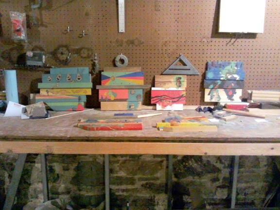 Tonight I found myself in studio able to putz around a bit and I started working through these three totems.  I am treating them all like pieces that work in the round.  I think that it likens the work to a more complete stage.  Here are the three that I was working on tonight.