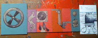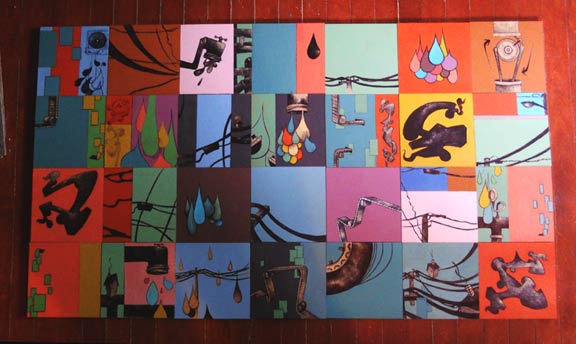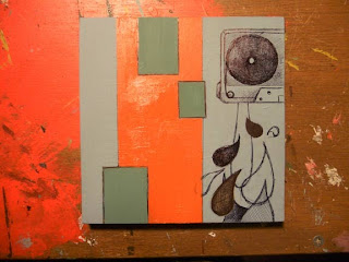 I am gaining momentum on my show for November.  The work is starting to get to a level that I felt I had last December before I sold a bunch of the six by six panels.  Looking back on it, I wish I had the 700 bucks I made on those panels back so that I could use that same work in the series that I am working on now.  The pieces make so little sense as small salable items.  I would like them back.  And so I am on to a new era in my art making.  I am looking to accumulate a body of work that I am proud of, that I wish to put in a show.  I think that the days of making work purely to fulfill the needs of the rules that I have set up for a given show are beyond me.  I want to show the fruits of my efforts in a more cohesive manner.  I think my idea will more easily come across if it is allowed to grow and change with the ideas of the new work influencing edits in the older work.  As I gain knowledge of what I am doing on newer panels, I still have the old panels to work with.  The cross referencing within these two lines of thinking ultimately lead to a better understanding of what I am doing.
