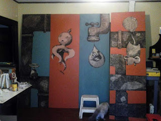 When I finished this piece, I immediately wanted to work on other things, but my gigantic mural project is in the way.  I have wanted so badly to want to work on something and the mural project has been in the way, but the interesting thing is that as soon as I started approaching the mural project as something that I just wanted to finish, I started to really get into it.  I started to try to make areas that were “done” much much better.  It is working now.  I had to make some quick adjustments to it today.  It felt good, like I was really painting.  Here is a quick, cruddy image of it.